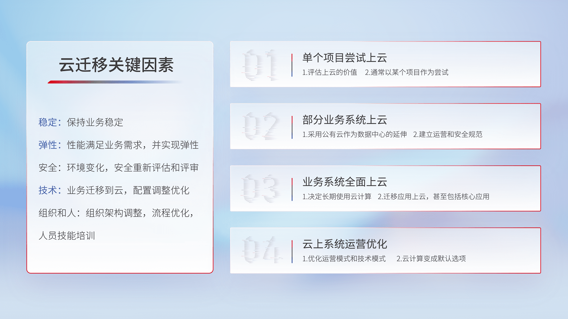 结合实际业务,,,,从规划设计、、、云平台选型、、、云原生改造、、、、数据迁移、、、集成交付,,迁移全过程为客户识别最佳上云路径,,,,做好风险识别管理,,,设计网络架构、、身份权限、、、、安全审计合规、、操作审计、、日志审计、、监控告警策略、、、、多站点容灾设计等,,对云上基础设施进行整体规划,,提升IT治理水平,,,,以满足弹性、、高可用、、、、高性能的需求。。。
